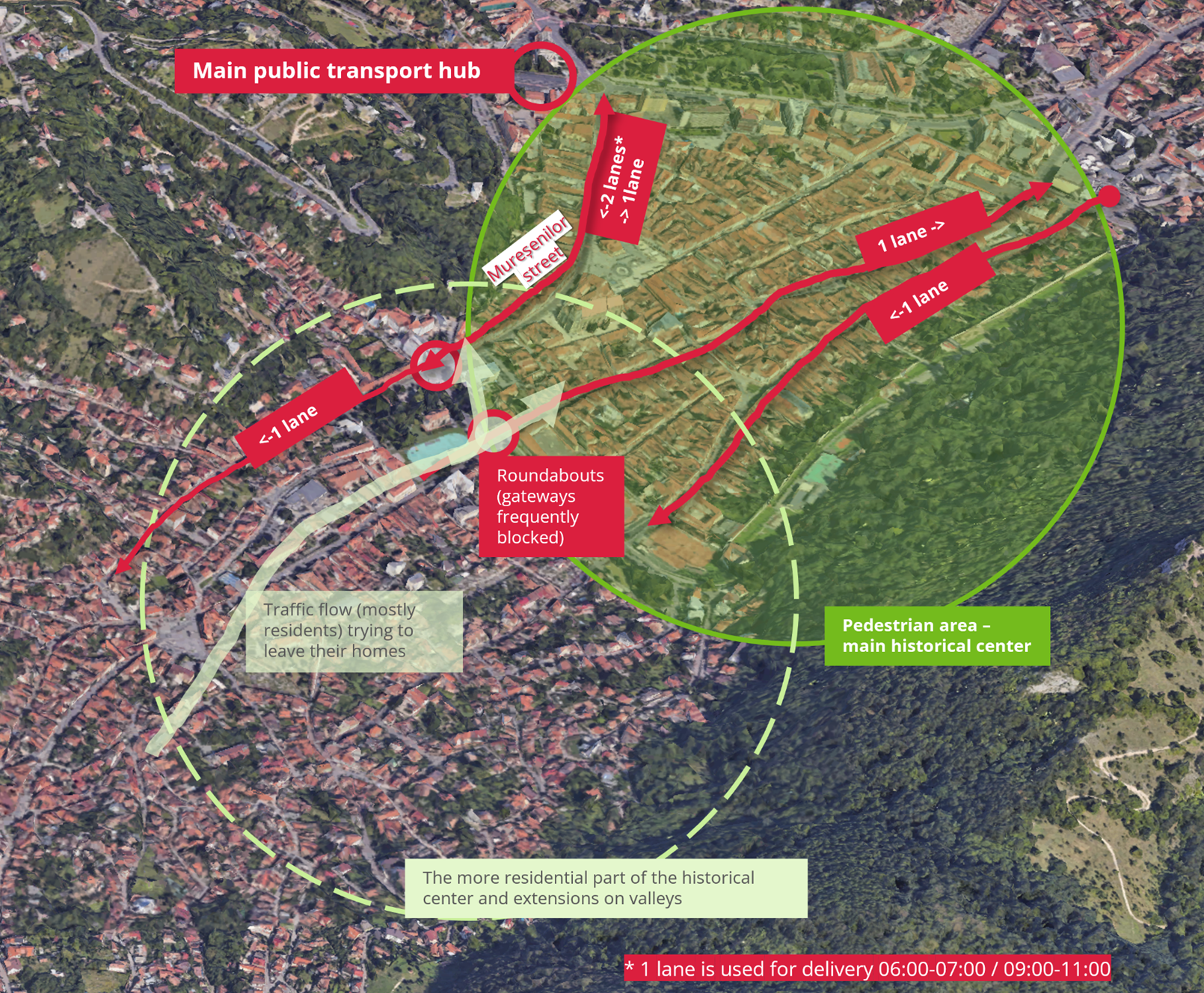 The historical centre was developed in a valley and is surrounded by mountains on 3 sides. Therefore, road capacity is very limited. Congestion often occurs given the low traffic capacity of the roads servicing the area. Most pressing are the two roundabouts at the end of Mureșenilor Street (the main artery servicing the historical centre) that are frequently congested causing gridlock in the area, sometimes generating queues longer than 1 km. The severe congestion in the central area traps citizens, logistics vehicles and crucial services like ambulances and public transport. Addressing this through innovative solutions could significantly improve mobility and ensure timely access to important services.